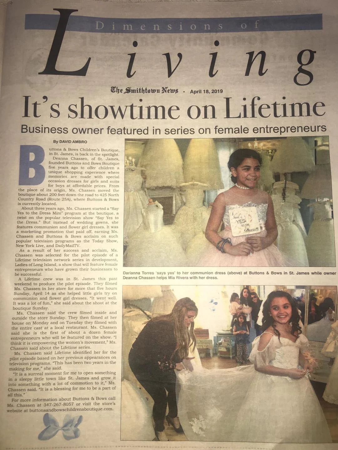 “Buttons & Bows Children's Boutique, in St. James, is back in the spotlight. Deanna Chassen, of St. James, founded Buttons and Bows Boutique five years ago to offer children a unique shopping experience where memories are made with special occasion dresses for girls and suits for boys at affordable prices. From the place of its origin, Ms. Chassen moved the boutique about 200 feet down the road to 425 North Country Road (Route 25A), where Buttons & Bows is currently located. About three years ago, Ms. Chassen started a "Say Yes to the Dress Mini" program at the boutique, a twist on the popular television show "Say Yes to the Dress." But instead of wedding gowns, she features communion and flower girl dresses. It was a marketing promotion that paid off, earning Ms. Chassen and Buttons & Bows acclaim on such popular television programs as the Today Show, New York Live, and DailyMailTV.